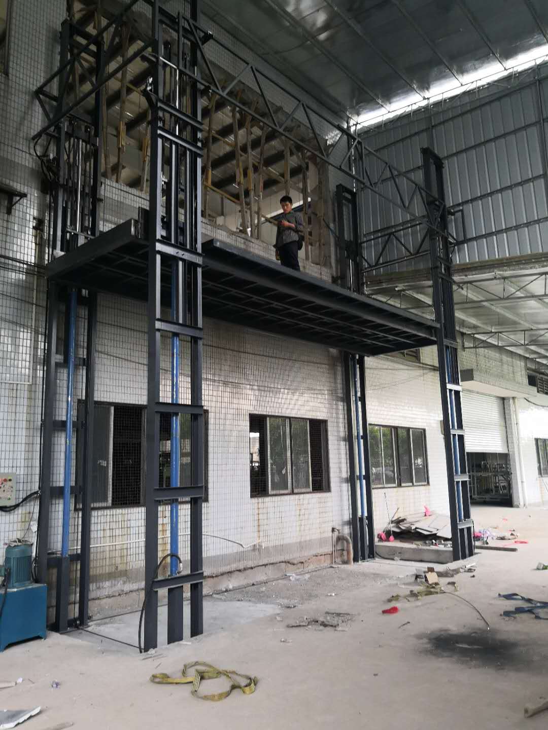 四柱式升降平臺采用了四角立柱+液壓油缸+板式鏈條+鋼絲繩等4重安全防護,且各樓層間設有限位開關及緩沖設備,緩解了升降平臺到達制定樓層時的緩沖力,且平臺設有緊急停止按鈕、緊急下降按鈕等,為各類突發事項做好了萬全準備。